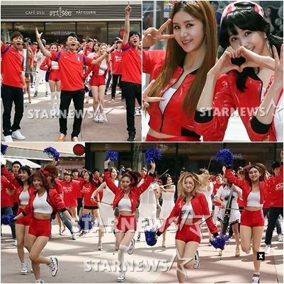 이날 뮤직비디오 촬영장에서 더 프렌즈와 피에스타는 보조 출연자들과 함께 저마다 개성 있는 빨간색 의상을 입고 나타나 시선을 끌었다.