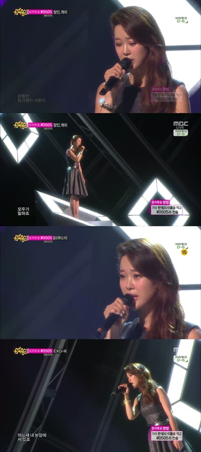 백지영은 7일 오후 생방송한 MBC '쇼! 음악중심'에 출연, '여전히 뜨겁게'를 열창했다.