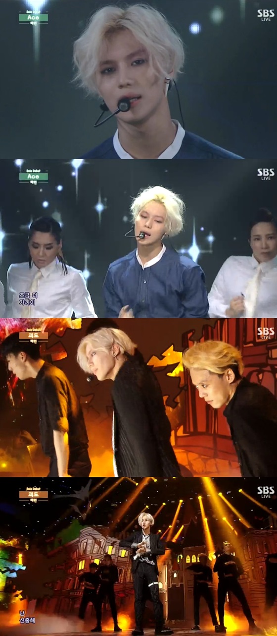 태민은 17일 오후 서울 등촌동 SBS 공개홀에서 생방송으로 진행된 SBS 가요 순위 프로그램 '인기가요'에서 첫 솔로 미니앨범 '에이스(ACE)'의 타이틀곡 '괴도'와 수록곡 '에이스'의 무대를 꾸몄다.