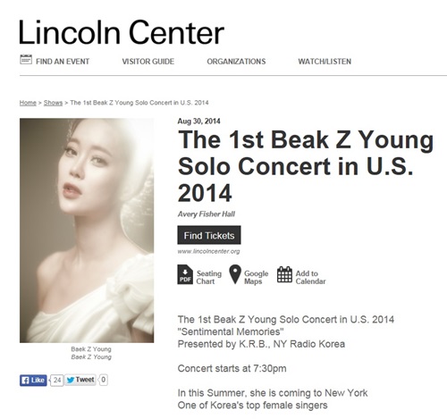 가수 백지영이 한국 대중가수 최초로 뉴욕 링컨센터에서 단독 콘서트를 개최한다.