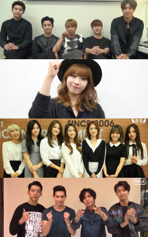 FT아일랜드(최종훈 이홍기 이재진 최민환 송승현), 씨엔블루(정용화 이종혁 강민혁 이정신), 주니엘, AOA(지민 초아 유나 혜정 민아 설현 찬미)는 12일 각 공식 유튜브 계정을 통해 하루 앞으로 다가온 대학수학능력시험 응원 영상을 게재했다.