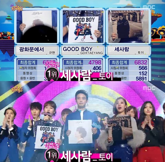 토이는 29일 오후 생방송한 MBC '쇼! 음악중심'에서 '세사람'으로 슈퍼주니어 규현의 '광화문에서'를 누르고 1위에 올랐다.