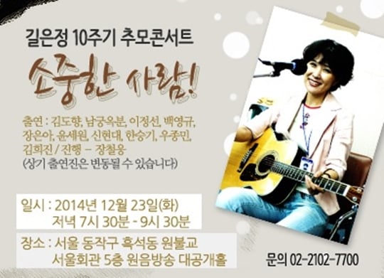 wbs 원음방송(서울 FM 89.7, 부산 FM104.9, 대구 FM98.3, 광주 FM107.9, 전북 FM 97.9MHz)은 故 길은정 씨의 10주기 추모 콘서트를 연다고 밝혔다.
