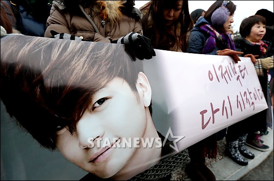 가수 세븐이 21개월간의 군복무를 마친 뒤 28일 오전 경기도 포천 영북면 8시단 7598부대에서 제대하는 가운데 이날 팬들이 세븐을 기다리며 응원하고 있다.