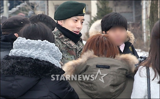 가수 세븐이 21개월간의 군복무를 마친 뒤 28일 오전 경기도 포천 영북면 8시단 7598부대 앞에서 팬들과 인사를 나누고 있다.