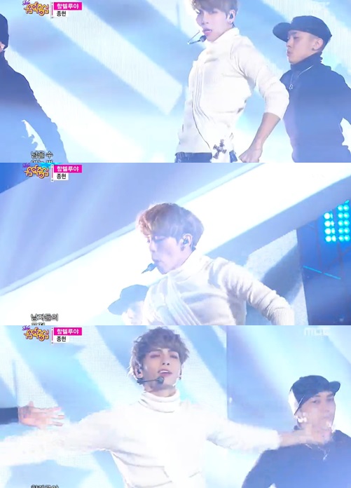 종현은 이날 첫 선을 보인 '할렐루야' 무대에서 온 몸을 이용한 댄스로 섹시함을 물씬 풍겼다. '할렐루야'는 사랑하는 여성을 찬양하는 가사로, 뇌쇄적인 종현의 매력이 부각돼 눈길을 끌었다.