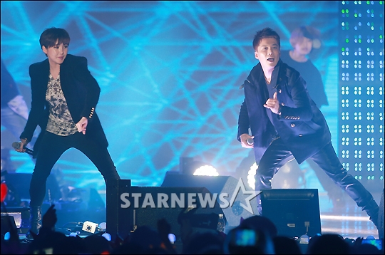 그룹 영턱스클럽 한현남, 박성현이 21일 오후 서울 송파구 방이동 올림픽공원 체조경기장에서 열린 '백 투 더 90s, 빅쑈' 콘서트에서 멋진 무대를 선보이고 있다.