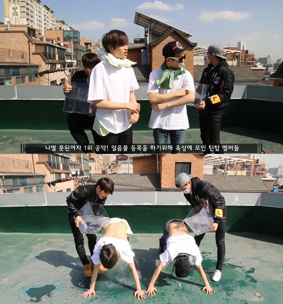 공개된 동영상에는 매서운 겨울 날씨에도 불구하고 1위 공약인 '얼음 등목'을 수행하는 니엘과, 1위 공약을 제시해 함께 등목을 하게 된 틴탑의 멤버 엘조, 공약 이행을 도와주기 위해 나선 리키와 찬조의 모습이 담겨있다.
