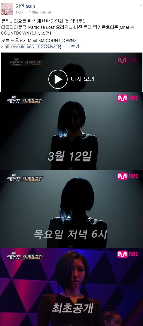 가인은 이날 오전 자신의 페이스북에 "뮤직비디오를 완벽 재현한 가인의 첫 컴백무대. 더블타이틀곡 'Paradise Lost' 오리지널 버전. 오늘 오후 6시 Mnet "라는 글과 함께 'M! COUNTDOWN' 415회 예고 영상을 게재했다.