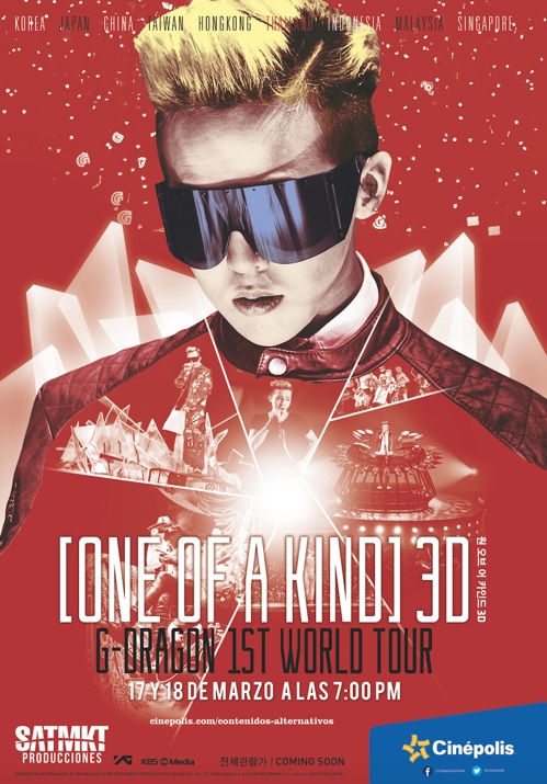 13일 소속사 YG엔터테인먼트에 따르면 지드래곤의 솔로 월드투어 다큐멘터리 필름 'ONE OF A KIND 3D G-DRAGON 2013 1ST WORLD TOUR'(이하 '원 오브 어 카인드 3D')가 오는 17일부터 멕시코 수도권 지역과 칸쿤, 푸에블라, 캄페체, 메리다 등에 위치한 시네폴리스 극장 20개 관에서 상영된다.
