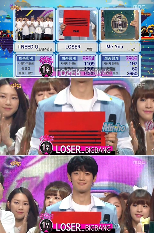 이로써 빅뱅은 지난 1일 '루저'로 컴백한 뒤 첫 가요프로그램 정상에 오르는 영예를 안았다. 빅뱅은 이날 '쇼! 음악중심'에 불참에 소감을 전하지 않았다.