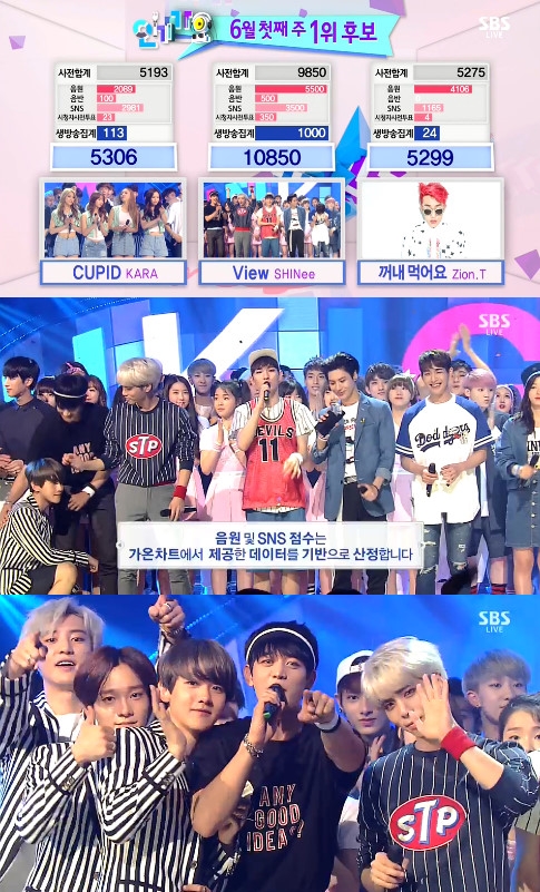 7일 오후 방송된 SBS '인기가요'에서는 카라의 '큐피드(CUPID)', 샤이니 '뷰(View)', 자이언티 '꺼내먹어요'가 1위 후보에 올랐다.
