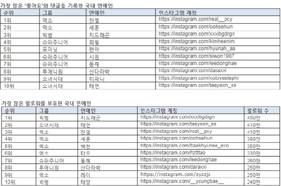 국내 스타들은 총 1억 5000만 명의 팔로워를 보유하고 있는 것으로 공개됐으며, 이 중 엑소의 찬열이 조사기간 동안 154개의 사진을 통해 9700만건의 댓글과 '좋아요'를 기록하며 가장 높은 영향력을 과시했다.