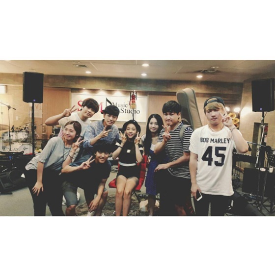 공개된 사진 속 백아연은 연습실에서 공연 스태프들과 모여 앉아 양손으로 브이자(V)를 그리며 환하게 웃고 있다.