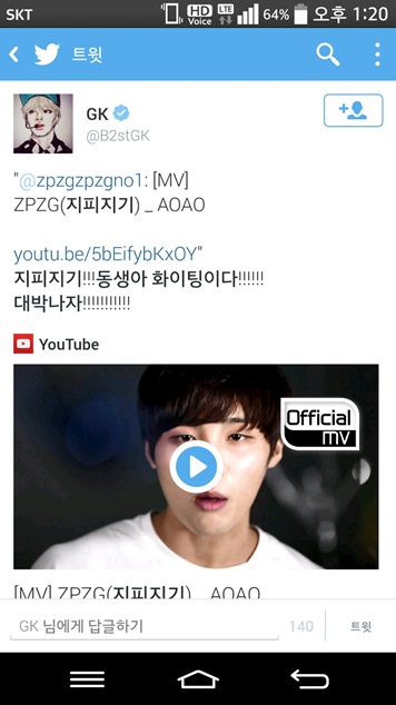 이기광은 30일 자신의 트위터에 "지피지기 동생아! 파이팅이다! 대박나자!"라는 문구와 함께 신곡 'AOAO'의 뮤직비디오 링크를 올리며 응원에 나섰다.