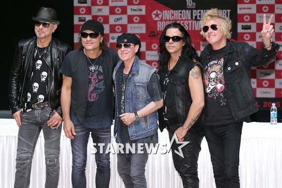 스콜피언스는 6일 오후 인천 송도국제도시 트라이볼에서 데뷔 50주년 내한 기자 간담회를 개최했다. 이들은 오는 7일부터 9일까지 송도국제도시 달빛축제공원에서 펼쳐지는 2015 인천 펜타포트 록 페스티벌 헤드라이너로 무대에 오른다.