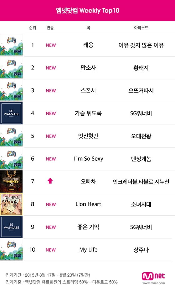 소녀시대는 정규 5집 타이틀곡 '라이언 하트'로 주간차트 8위에 새롭게 진입했다. '라이언 하트'는 중독성 강한 복고풍 멜로디의 음악으로 소녀시대의 활발한 방송활동과 함께 음원차트 인기를 이어갈지 기대를 모은다.