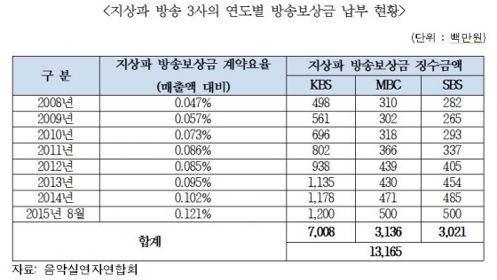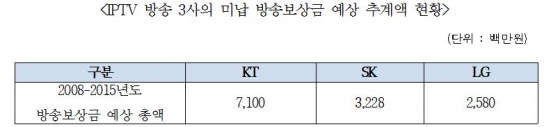 국회 교육문화체육관광위원회 소속 새누리당 김학용 의원(경기 안성)이 문화체육관광부로부터 제출받은 자료에 따르면 연매출 2조 5000억원(2014년 기준)에 달하는 IPTV 방송 3사가 지난 2008년 출범 이후 현재까지 가수 및 연주자 등 음악실연자와 음반제작자 등에게 지급하지 않은 방송보상금은 약 100억원대에 달하는 것으로 나타났다.