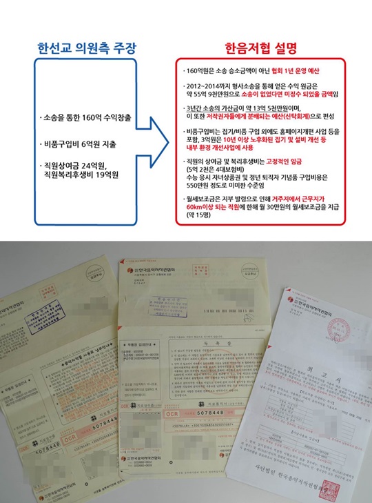 한음저협은 "한선교 의원이 공연사용료 소송 수익이 2013년 165억3700만원, 2014년 168억9400만원, 2015년 7월 현재 91억4500만원이라고 했으나, 협회 전체 1년 운영비용(일반회계)이 약 160억원 가량이다"라며 "2012년부터 2014년까지 형사소송을 통해 얻은 수익 원금은 약55억 9천만 원으로 소송이 없었다면 저작권료 55억 9천만원은 미징수 되었을 금액이다. 소송 가산금(30%)으로 얻은 수익은 약 13억 5천만원으로 이 또한 저작권자들에게 분배되는 예산(신탁회계)으로 책정되어 협회 운영비와는 사실상 무관한 비용이다"라고 설명했다.