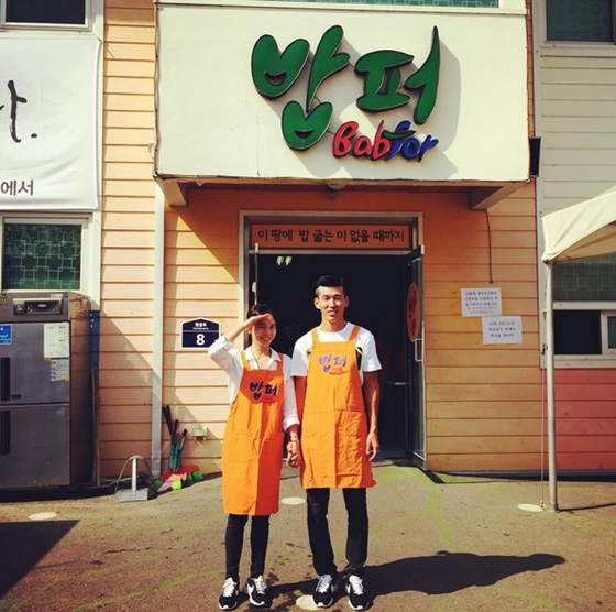 공개된 사진에는 소외계층에게 식사를 대접하는 '밥퍼' 건물 앞에서 앞치마를 걸치고 포즈를 취하고 있는 션과 정혜영의 모습이 담겨있다.