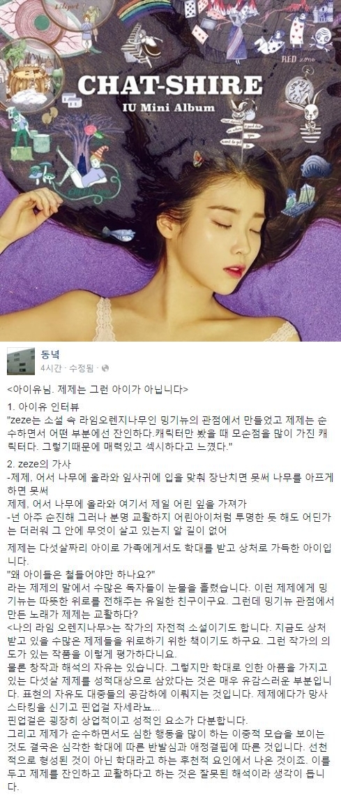 동녁은 5일 오전 페이스북을 통해 '아이유 님. 제제는 그런 아이가 아닙니다'라는 제목의 글을 게재했다.