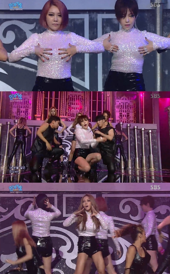 브라운아이드걸스는 8일 오후 방송된 SBS 가요순위프로그램 '인기가요'에서 신곡 '신세계' 무대를 꾸몄다.