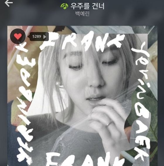 공개된 사진에는 백예린의 첫 번째 솔로 앨범 'FRANK'의 타이틀곡 '우주를 건너'의 재생 화면이 담겨있다.