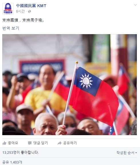 하지만 대만에서는 상반된 반응을 보였다. 대만 집권당인 국민당이 총통 선거를 이틀 앞둔 14일 공식 페이스북을 통해 공개적으로 쯔위를 지지하고 나섰다.