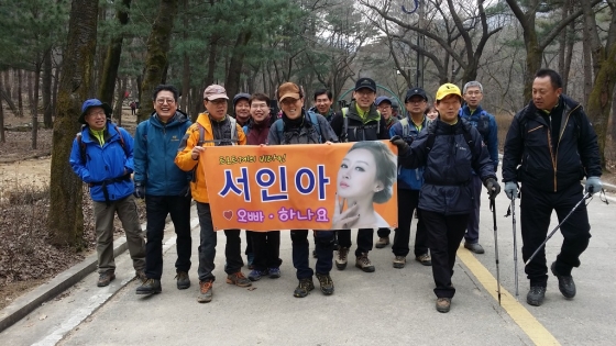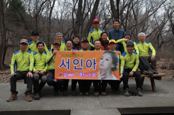 재경오일산악회 회원 30여 명은 지난 13일 서울 관악산 입구에서 서인아의 신곡 '오빠'를 열창하며 행진을 벌였다.