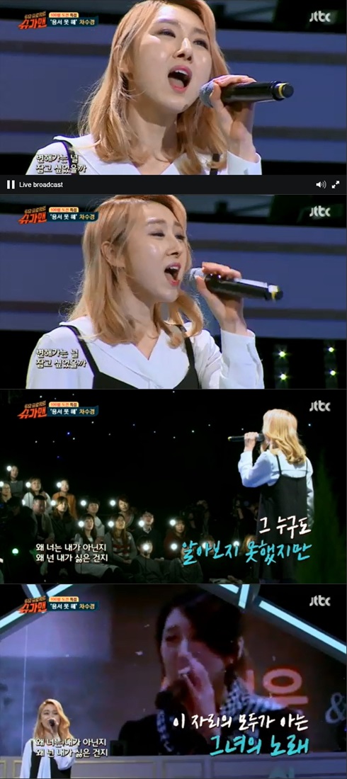 15일 오후 방송된 JTBC '투유 프로젝트-슈가맨을 찾아서'(이하 '슈가맨')에는 가수 차수경이 출연해 '용서 못해'를 불렀다.