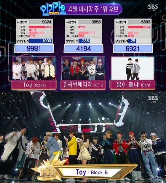 블락비는 24일 오후 방송된 SBS 음악순위 프로그램 '인기가요'에서 '토이'(Toy)로 1위를 차지했다.