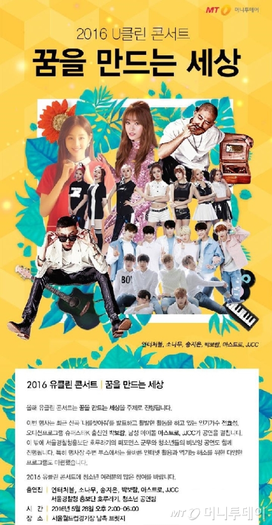 송지은, 박보람, 아스트로, JJCC, 소나무, 언터처블은 오는 28일 오후 2시 서울월드컵경기장 남측 브릿지에서 열리는 2016 u클린 청소년 문화 콘서트에서 공연을 펼칠 예정이다.