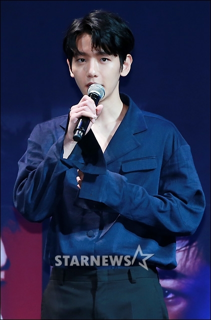 백현은 8일 오전 서울 강남구 삼성동 SMTOWN 코엑스 아티움에서 열린 정규 3집 '이그잭트(EX’ACT)' 컴백 기자회견에서 '럭키 원' 뮤직비디오 촬영 에피소드를 묻자 "'럭키 원' 촬영할 때 악당 간호사가 있다. 그 분들이 서 있고, 못 본 척 춤추는 장면이 있었다"고 말했다.