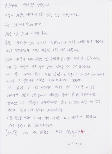 우선, 본론부터 말씀드리자면 그동안 많은 고민과 이야기를 통해 앞으로 '백퍼센트 창범'이 아닌 '창범'으로서의 새로운 시작을 하게 되었다는 사실을 알려드리고자 무거운 마음으로 펜을 잡게 되었습니다.