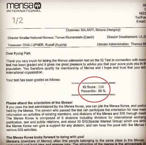 박경은 8일 자신의 인스타그램을 통해 'IQ 156'이라는 수치가 적힌 통지서를 공개했다. 멘사 회원 자격 통과 기준은 IQ 148이다.