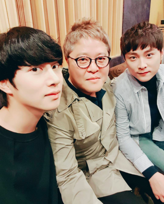 사진 속 김희철은 '나비잠' 작곡가인 이상준, 민경훈과 다정하게 앉아 카메라를 응시했다.
