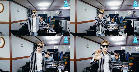 18일 오후 방송된 네이버 V앱 '김재중 콘서트 D-3 밴드연습실 습격!'에서 김재중은 검은 선글라스를 쓰고 캐주얼한 차림으로 등장했다.
