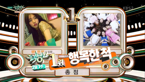 수지는 3일 방송된 KBS 2TV '뮤직뱅크'에서 '행복한 척'으로 트와이스의 'TT'를 상대로 1위를 차지했다. 수지는 방송에 등장하지 않아 수상 소감은 전해지지 않았다.