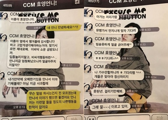 자신을 전 타이라 스태프라 밝힌 한 네티즌이 9일 한 온라인 커뮤니티에 공개한 효영과 아름 간 SNS 메시지