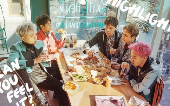 공개된 사진에는 윤두준, 용준형, 양요섭, 이기광, 손동운 등 하이라이트 멤버들이 다정하게 마주 앉아 피자를 나눠 먹고 있다.