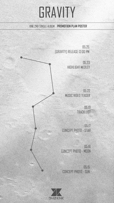 크나큰은 12일 공식 SNS를 통해 오는 25일 발표할 2번째 싱글 앨범 '그래비티'(Gravity)의 프로모션 플랜 포스터를 공개했다.