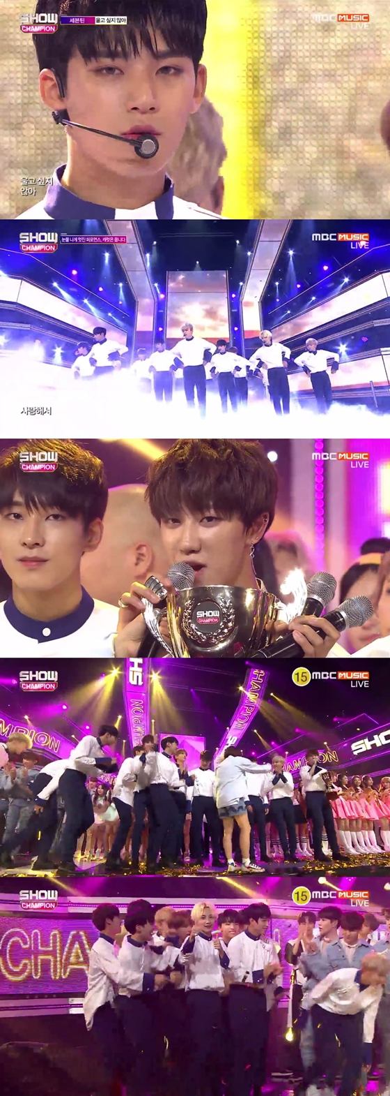 아이돌그룹 세븐틴의 '울고 싶지 않아'가 '쇼! 챔피언'에서 1위를 차지했다.