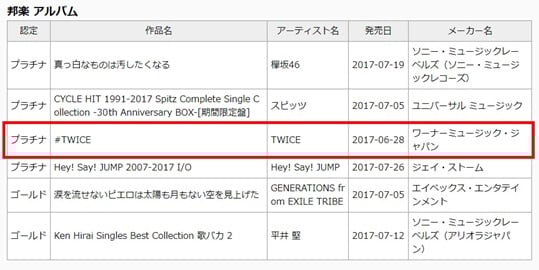 걸그룹 트와이스의 일본 데뷔 앨범이 25만장의 판매고를 올리며 플래티넘 음반에 등극했다. 국내 아티스트로는 유일하게 플래티넘 반열에 이름을 올리며 독보적인 기록을 세우고 있다.
