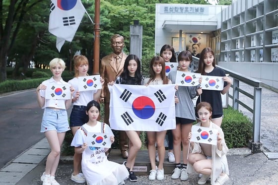 공개된 사진에서 다이아 멤버들은 도산 안창호 동상 앞에서 태극기를 펼쳐 보이며 미소 짓고 있다.