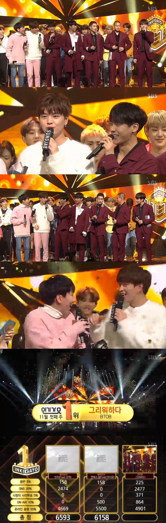 비투비는 5일 오후 방송된 SBS 음악순위프로그램 '인기가요'에서 '그리워하다' 1위의 영예를 안았다.