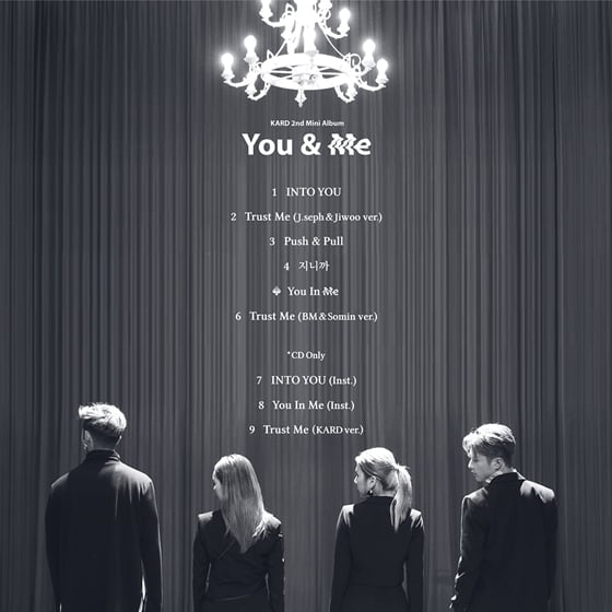 이날 공개된 트랙리스트 이미지에는 수트를 차려 입은 KARD 멤버들의 뒷모습이 흑백 사진으로 처리되어 몽환적이면서도 멋스러운 분위기를 자아냈다. 더불어 타이틀 곡인 'You In Me'를 비롯해 'INTO YOU', 'Trust Me(J.seph&Jiwoo ver.)', 'Push & Pull', '지니까', 'Trust Me(BM&Somin ver.)'까지 6개의 트랙이 담겼다.