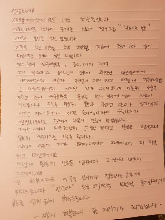 한소아 소속사 새로움엔터테인먼트 최선침 대표는 18일 소속사 공식 SNS를 통해 자필 편지를 공개했다.