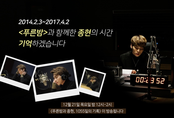 MBC 라디오 측은 20일 공식 홈페이지에 "12월 21일 밤 12시부터 2시까지(22일 오전 0시부터 오전 2시까지) '푸른밤과 종현, 1055일의 기록'이 방송됩니다"라는 공지사항을 게재했다.
