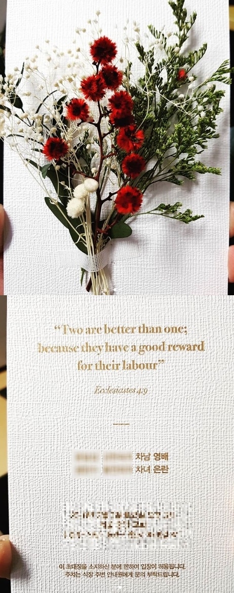 공개된 사진 속에는 예쁜 꽃으로 장식된 청첩장이 담겨있다. 차남 영배와 차녀 은란(민효린의 본명)으로 적혀진 청첩장에는 초대장을 소지하신 분에 한하여 입장이 허용된다는 문구가 적혀있다.