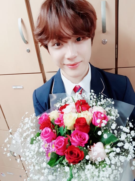 공개된 사진에서는 멤버들이 선물한 꽃다발을 들고 청량한 미소를 짓고 있는 주학년과 전원 스쿨룩 의상을 맞춰 입은 더보이즈 멤버들의 다정한 모습이 담겼다.
